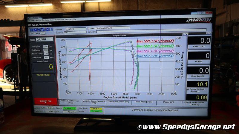 After running 10.51 at 131MPH in the quarter mile a couple weeks ago, I was curious how much horse power Go Man Go was putting down. I had the chance to attend a local dyno day and the results surprised me as much as the track times. The dyno was a Dyno Dynamics brand, which is supposed to be pretty accurate from what I'm told. Watching several other cars run ahead of Go Man Go and knowing what I thought they should make gave me a bit more confidence. In the end we put down 669.6 RWHP on the first pull, 661.1 on the second, and 652.3 on the third. That averages to exactly 661RWHP for all three runs and is quite impressive bone stock and on plane o'l 93 octane. I was expecting about 650RWHP based on the track times. Lots of potential with this already VERY fast car :)