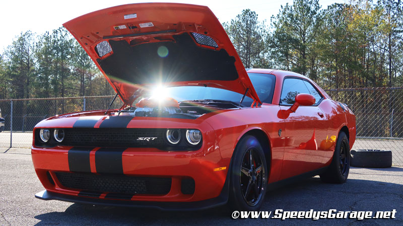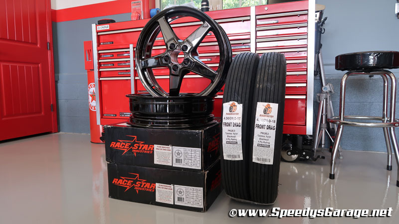 On Orange Krush I had a lot of success at the track with a Weld wheel setup. Rears were 17x10 forged aluminum and fronts were 17x4.5. These were strong and lightweight. When I got the Hellcat, I hoped these would mount right up, but unfortunately the 17x4.5 fronts wouldn't clear the massive Hellcat brakes and at this time Weld is not offering an 18" wheel for the Hellcat. Step in Racestar, who's 18x5 front wheels are lightweight and fit the Hellcat just fine as long as you pay attention when mounting any necessary wheel weights. Tires for the front are M&H 4.5x28x18 front runners and the rears will be Hoosier 28x10x17 slicks. The Racestar Darks P/N is 92-850445 and has a -20 offset, 5x115 bolt pattern, and 78mm hub bore. The wheels include everything needed to mount them all the way down to the 7/8" socket.