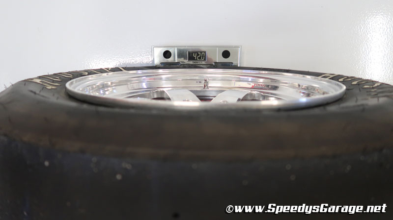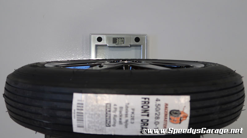 All in the rear tire setup weighed in at 42 pounds and the front tire setup tipped the scales at 38 pounds. Total weight for all four wheels and tires was 160 pounds. The factory Brass Monkey wheels with Perelli all season tires came in at 246 pounds, so running the race wheel/tire combo saves 86 pounds!