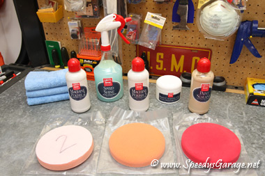 Griot’s Garage polishes are designed for use with random orbital machines. Their microscopic abrasives slowly break down as the product is massaged into the vehicle’s surface, getting finer as you work. Griot’s makes a special orange polish pad specifically for use with their machine polishes as well as polishing kits to get you started. The polishes will wash out of the pads with warm water; however, I number the backs of my pads so that I always use the same pad with the same polish number.