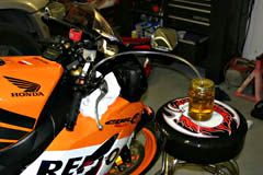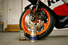 March 2006 The brake system on the CBR 1000RR is pretty adequate in stock form, however I decided to upgrade to Galfer stainless steel lines and make some other modifications at the same time. If you're going to work on the brake system, it's best to do everything at once as anytime you change out a component affected by the brake fluid you have to bleed the brake system. Doing everything at the same time means you only have to bleed the system once which saves time and money on brake fluid. With these upgrades you will gain braking performance, drop 0.59 lbs of weight from the bike, clean up the tail section, and make future brake maintenance much easier to perform. You'll need Galfer stainless steel brake lines, some DOT 4 brake fluid (I like Valvoline Syntec), a 15cc Brembo reservoir, zip ties, some plastic 3/8" (10mm) cable clamps, and some Speed Bleeders. The Speed Bleeders on the 1000RR front calipers are of a different size than those on the front master cylinder and rear caliper, so be aware of that. The front calipers are 7mm x 1.0 and the front master cylinder and rear brake caliper are 8mm x 1.25. You'll also need some kind of container to catch the brake fluid in when you drain the stock lines, as well as when you bleed the system after installing the new components.