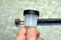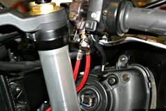 Installing Speed Bleeders is optional, but they greatly reduce the time required to bleed the brake system. I'd say it's at least twice as fast to bleed the system if not faster. They're cheap and easy to install so there's really no reason not to change them out while you're working with the brake system. Speed Bleeders incorporate a small valve that will only allow fluid to flow one direction meaning you can loosen the bleeder a couple of turns, and simply pump the brake lever until all the air bubbles are removed from the brake system. With standard bleed valves you'd have to loosen the bleed valve, depress the brake lever, tighten the bleed valve, then release the brake lever. You'd have to complete that cycle over and over until all the air was removed from the system. If you make a mistake and forget to tighten the bleeder before releasing the brake lever you'll draw air back into the brake system and have to start all over. As you can see Speed Bleeders are a great asset. To install Speed Bleeders simply remove the stock bleeder valves with a 10mm wrench. Replace the bleed valves at the front calipers with 7mm x 1.0 Speed Bleeders. The torque value for the front caliper bleeders is 5.8 ft/lbs (7.8NM). Replace the front master cylinder bleeder with a 8mm x 1.25 Speed Bleeder and do the same for the rear caliper. The torque value for the front master cylinder and rear caliper bleeders is 4.3 ft/lbs (5.8NM). Be aware of the front caliper bleeders being of smaller size than the front master cylinder and rear caliper. Some parts books even miss this fact, so be sure to ask for verification when ordering. You can tell no difference between a Speed Bleeder and a standard bleeder by appearance.