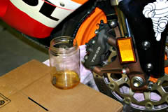 You'll need to begin by removing the 12mm banjo bolt that holds the stock brake lines to the front calipers. Once you've removed the lines from the calipers, set them into your container and let them drain for 10 or 15 minutes to get most of the fluid out of the lines and front master cylinder reservoir. BE CAREFUL with the brake fluid. It can eat painted finishes according to warnings on the container. Keep plenty of rags around and cover any areas of the bike where it's obvious brake fluid could drip on a painted surface.