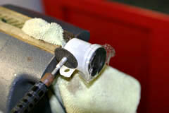 Next, I shaved the plastic tab off the Brembo 15cc reservoir to give it a cleaner look. I just used a dremel tool with a cut off wheel, then used a dremel sanding wheel to even it up. Finally I did a light sanding with 220 grit sand paper to clean up the area. I put a little bit of tape over the reservoir opening to protect it from any debris caused by the cutting and sanding.