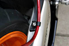 Once the front is complete, move to the rear. Remove the stock 12mm banjo bolt at the caliper and let the stock line drain. Then remove the 12mm banjo bolt that attaches the stock line to the rear master cylinder. Protect the painted surfaces of the bike with rags. Remove the 5mm button head hex bolt that mounts the stock rear line to the swing arm and remove the stock rear line. Install the Galfer ss line using the included 14mm banjo bolts and again be sure to sandwich the lines between crush washers at the caliper and rear master cylinder. Torque the Galfer banjo bolt to 12-15 ft/lbs (16-20NM). Use one of the 3/8" cable clamps to replace the stock grommet that mounts the ss line to the swing arm. Make sure the line is secured in such a way that it will not come in contact with the rear tire.