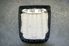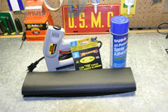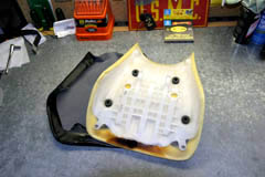 Honda CBR 1000RR Carbon Fiber Vinyl Seat Covers June 2005 When doing my stock dyno runs I decided to open up the baffles in the stock exhaust to see what power could be gained just for kicks. I got a little carried away with the process and inadvertently made a hole in the rear of my stock muffler which I did not realize occurred. When going for a test ride the hot gas from the exhaust caused a small amount of damage to my under tray and driver's seat. The damage was minor, but the stock vinyl was melted toward the rear of the stock seat. This gave me an opportunity to upgrade to carbon fiber vinyl on the seats. To complete this project you'll need a heavy duty stapler with 1/4" (6mm) staples, some new vinyl material that is "marine grade", a flat head screw driver, needle nose pliers, and a hair dryer. I used a Stanley electric stapler but it was a real pain to use and only about 1 in 4 staples went into the seat properly. I would have to pry out the bent or crooked staples and redo them constantly which greatly increased the time to complete this project. I HIGHLY recommend using a pneumatic upholstery stapler for this task to avoid the frustration. Spray adhesive might be helpful, but is optional and I did not use any. If you find the stock seat too hard on the o'l bum, now would also be a good time to add some gel material as well. I've not had problems with the stock seat, and the gel material is pricey at about $80 US for a 12"x12" square, so I decided to just replace the vinyl and leave the foam as is. Putting gel in wouldn't be too difficult. You'd just need to trim out some of the stock foam material to fit the gel into the contour of the seat.