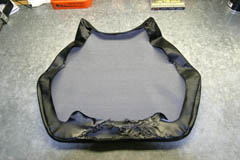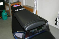 Once you have the new vinyl cut out, lay the rear seat down on the vinyl and start to shape the vinyl to the seat to make sure your pattern and cutting are correct. You'll need about 3/4" to 1" of vinyl to overlap the seat to give you room to staple. Once you're sure it will fit, begin stapling the vinyl in place. Put one staple in the top and one in the bottom to hold the vinyl in place, then work your way around the edges pulling the vinyl snug to the seat and use a hair dryer to heat up the vinyl to make it stretch into place to help it contour to the shape of the seat. Once you have the new vinyl stapled in place, put the bracket back on the seat. The hand strap is optional and I left mine off. If you decide to leave the strap off, you'll need to use a couple of small washers to act as spacers under the rear seat bracket hooks. Make sure to use wide enough washers to give the hooks a solid base. The front seat requires a little sewing in order to fit properly. I've heard of people just wrapping the vinyl around the seat, but with the shape of the foam, I don't think the seat will look like it fits the bike properly using that method, so I advise having it sewn just as the stock seat is. Again, use a small flat head screw driver and needle nose pliers to remove the staples in the stock vinyl. Once removed, use a sharp knife to cut the thread holding the stock vinyl together. Then use a hair dryer to heat the stock vinyl to make it lie flat. You might want to let it set overnight or heat it several times to get it as flat as possible. Then use the three pieces from the stock driver's seat to trace out a pattern for each of the three pieces in your new vinyl. Cut these pieces out paying attention to the little jagged edges on the side pieces. Once you have the three pieces cut out, sew them together in the same fashion the stock seat was sewn. My Dad sewed mine together for me and it came out great. Once it's sewn, just slip it over the seat and staple in place. Remember to leave a little room around the rear mounting holes so the vinyl can be lifted up to allow you to get to the screws. One thing to be aware of is that the carbon fiber vinyl is directional, so be sure to match up the direction for the driver's and passenger's seats. You can see the burn mark the exhaust left on my stock driver's seat. That is the reason I upgraded the vinyl.