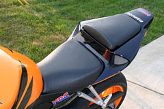 Mounted to the bike the seats look great and go along well with the other carbon fiber details such as the Honda wings on the tank cover on my Repsol model. The only down side that I've found to this material is that it's not as slippery as the stock vinyl, so you don't slide around in the seat as easily. That's not really a huge issue for me but if you see a lot of track time or race, you may want to find a vinyl that is more smooth. As I said, I left my passenger seat strap off the bike as it's really not good for anything, but I took a picture with it on the bike so you can see the difference. |