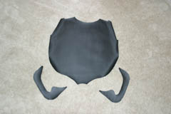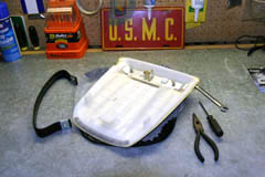I began with the rear seat. Remove the 10mm bolts on the bottom side of the seat, then remove the hand strap and bracket. Using a small flat heat screw driver and needle nose pliers, pull the staples out of the bottom of the seat and remove the stock vinyl. Then use a hair dryer to heat the stock vinyl and work with it until it lays flat. Let the stock vinyl set over night to become as flat as possible. Lay the stock rear seat vinyl on your new vinyl and trace it to make a pattern for your custom seat. Once you have the pattern traced, simply cut it out. It's best to trace on the back side of your new vinyl so that the trace marks are hidden after it's installed.