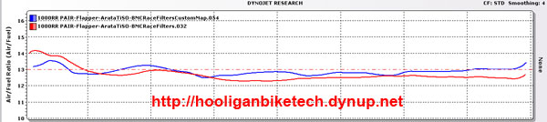 Below are the dyno graphs showing the baseline runs vs. the custom map as well as the A/F ratios. The red hashed line corresponds to a 13:1 A/F ratio which is what you're shooting for with a custom map.