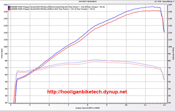 After arriving at TNT Performance Dyno, Konrad double checked everything on the bike to make sure it was in proper order such as the oil level, coolant level, tire pressures, etc. He then strapped the bike into the dyno, brought the bike up to normal operating temperature, and took 4 base runs to give us an idea of where the bike was currently. The baseline runs were taken with an Arata titanium slip on, BMC race filters, Flapper Mod, and with the PAIR system blocked. The PCIII USB was loaded with a zero map for the base line runs as well. The best of the 4 runs resulted in max numbers of 151.31HP and 78.34 ft/lbs of torque using a standard correction factor and smoothing of 4 in Dynojet's RunViewer software. I then left the bike with Konrad for a few hours for him to work his magic.