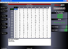 The way the PC3 works is pretty simple, yet effective. The air and fuel ratio is broken down into a grid consisting of 250 RPM increments and throttle position percentages within the PC3. At each 250 RPM increment and 0,2,5,10,20,40,60,80, and 100 percent throttle positions you can set a value to either add fuel (richen the mixture) or take fuel away (lean the mixture). This in turn allows you to custom program the fuel injection system on the bike to run at optimum efficiency. The stock ECU is designed to meet EPA requirements and runs very lean in the lower RPM ranges and then becomes rich in the upper RPM ranges. Getting the proper amount of fuel and air to the combustion process at the proper throttle position and RPM is paramount to performance.