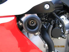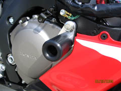 Honda CBR 1000RR Shogun No Cut Frame Sliders Updated February 2006 After reading several reports of the Shogun Sliders bending in low speed incidents or tip overs I removed them and installed a set of Vortex Cut Type Sliders. Below are pictures of what happened when a stationary bike fell over with these sliders attached. Notice the damaged water elbow. To replace this part requires dropping the motor and is billed as an 18 hour job at the dealer.