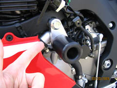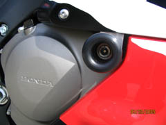 To install these sliders simply remove the mid plastics on the 1000RR which consists of a handful of button head hex bolts and a plastic tab or two. Remove the 17mm engine retaining bolt located just inside the mid fairing. Assemble the slider making sure the puck is securely attached to the base using the included 8mm bolt. Then use the included 17mm bolt to attached the slider assembly to the bike. Torque this 17mm bolt to 47 ft/lbs (64NM) per Honda's torque rating. I personally torqued my bolts to 50 ft/lbs to insure the slider doesn't rotate into the fairings in the event of an incident, but be careful not to over tighten the bolts. When installing the sliders try to space the slider pucks evenly from the fairings giving as much room as possible. The longer slider base is designed for the left side of the bike, while the shorter slider base is meant for the right. I recommend putting a little antiseize compound on the threads of the bolts. This will keep them from corroding and make it easier to remove them in the future should you ever need to.