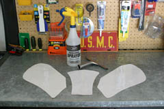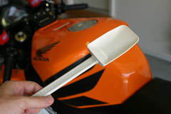 Honda CBR 1000RR Tank Slapper Tank Protector August 2005 I wanted to get a little protection on my tank to avoid scratches and dull spots from my riding gear rubbing. I began looking into various products from carbon fiber over lays to the stick on type tank protectors that are common today. The carbon fiber overlay was a little bit overboard on the carbon fiber for me, and the stick on type I see on other people's motorcycles tend to either peel or leave a nasty gooey edge over time. I was turned onto a product called The Tank Slapper by a fellow board member at the 1000RR.net message board and decided to give it a try. It was cheap, much cheaper in fact than the stick on type, so if it didn't work out it wasn't too much of a loss. The product is a non adhesive 3M film that is pre cut to fit the tank. It is three pieces, two for the sides and one for the area just in front of the pilot seat. To install it you need a spray bottle with a fine mist, a squeegee or spatula, a bucket of water, and possibly a hair dryer.