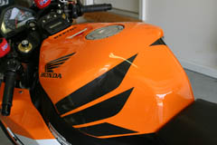 I've had this product on my bike for about 800 miles and have had no problems. You can remove the Tank Slapper and re-apply it if necessary as it uses no adhesives. Once installed and all the air bubbles removed it's virtually invisible, as you can see in the picture of it installed below. It does a good job of protecting the tank areas for normal street riding, but for race use you'll need to find a more durable product as I'd imagine the Tank Slapper material would tear with heavy race use. |