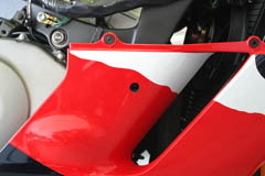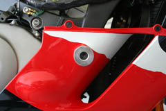 I originally thought I'd use a 1.75" (44.45 mm) hole saw with a pilot bit to make the necessary holes in the lower fairings. My thought was to use some white paint on the mounting bolt to make a mark on the inner fairing so I'd know where to drill. I decided to get the opinion of Matt McCord who's my friendly neighborhood bike salesman as well as a good friend that has a lot of experience with cut type sliders among other things bike related. He suggested an alternative method. Matt happened to be installing a set of sliders for a client and invited me to his shop to watch his installation method. After watching him perform this task, I decided his method would provide a cleaner installation.
