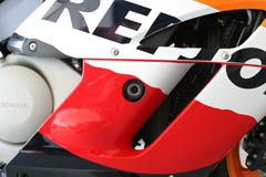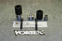 After reading several reports of people with 1000RRs going down on the left with the Shogun No Cut Frame Sliders and cracking the water elbow behind the slider, I decided I'd upgrade to the cut type sliders. I'd rather have a hole in my fairing for the slider rather than have to drop the motor to replace a water elbow. My thinking is that there is going to be some type of damage to the plastic if the incident is even at a slow speed with either type of slider, cut or no cut. I'd rather just replace plastic rather than replace plastic and spend hours dropping and reinstalling the motor due to the cracked water elbow. I chose the Vortex brand of slider as it is a two part design allowing you to replace the slider puck independent of the rest of the slider making it cheaper than having to replace an entire set of sliders should one of the units need to do it's job. I had Vortex sliders on my 2003 Honda 954RR and although I never had to test them, I was very happy with the quality and design. The 954RR didn't require fairing modifications to install them, however. The Vortex sliders are relatively light weight at 1.34 lbs (0.61 Kg) and have a large aluminum base that the puck attaches to. The pucks are side specific so be sure to pay attention to the brief instruction sheet explaining which puck goes on each side of the bike. The longer bolt is used on the right side of the bike.
