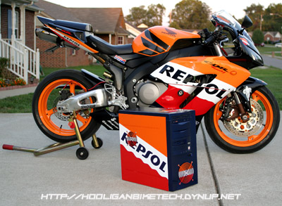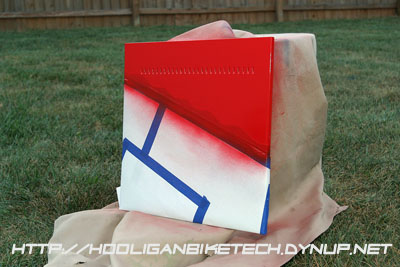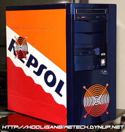 I had collected enough spare parts over time to build a complete system. The only issue was the drab beige case that just wouldn't look all that great sitting in the living room next to my entertainment center. I wrestled with what color to paint this vanilla computer case and considered black, black with flames, red, red with flames, and finally had an epiphany. Repsol Replica! Not only can I show my support for one of the best products I've tried, Repsol Lubricants, but also combine two of my hobbies.....computers and motorcycles. Once I spent a few days convincing my girl friend that a Repsol Replica computer would be a great addition to the otherwise tame furnishings in my living room, I was off to pick up the primer, paint, tape, and wet dry sandpaper.