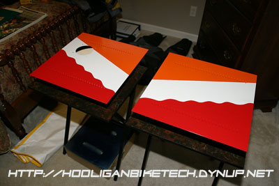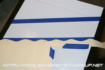 I applied a white base coat to the primed and sanded computer side panels and let them dry overnight. I then went back to my measurements to determine the angle and how wide each color would be on each side of the case. I made a template to mark the wavy edge the red would have where it meets the white and then traced this template onto a strip of tape applied to the case sides. I then used a razor to trim the tape to the wavy edge so that the paint matched as closely as possible to the graphics on the CBR1000RR Repsol Edition motorcycle. With the orange, red, and white areas marked and matched to each side of the case, I masked off portions of the case sides with painter's tape and paper to get the three colors applied.
