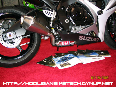 More "GP exhaust on the 2006 GSXR 600. This is by Yoshimura. Note the majority of the can is under the bike. |