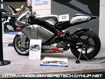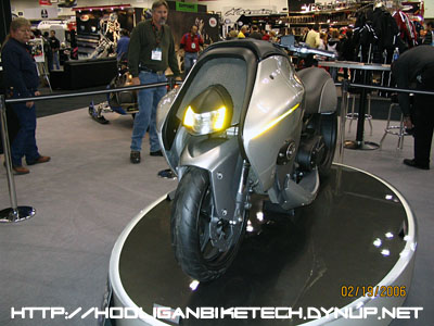 This was a very interesting motorcycle called the MotoCzysz. It's a prototype being introduced by an American company to compete in MotoGP. The motor's design is what makes it so unique as it's totally balanced to virtually eliminate gyroscopic and torque effects. The motor is only 6.5" wide, which is the same width as the rear tire! |