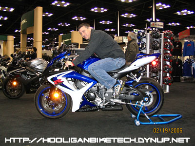 Here's my buddy Matt drooling over the 2006 GSXR 600. His race bike is a 2005 model so he had a particular interest here. |