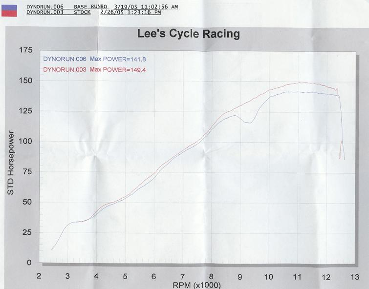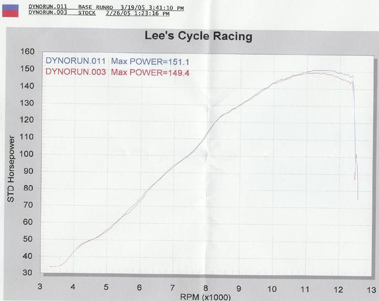 The dyno graphs below are from a 2004 CBR 1000RR utilizing a PCIII and a Yoshimura RS-5 slip on exhaust. The PCIII map used is the one provided on the Dynojet website www.dynojet.com for a 1000RR running the Yoshimura RS-5 slip on. The top graph shows what happens when you hook up the PCIII to the upper injectors. Notice the over all loss in power as well as the huge dip around 9,500 RPM. The bottom graph shows the same bike running the PCIII hooked up properly to the lower set of injectors. The power gain is what is expected for a slip on and there is no dip at 9,500 RPM.