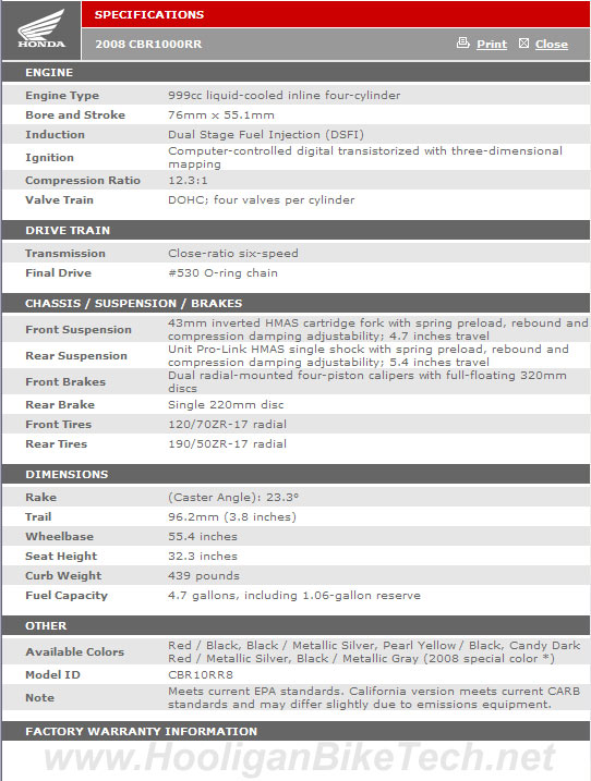 Honda CBR 1000RR Specifications 2008