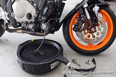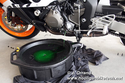 Changing the coolant is an easy process that takes about 45 minutes, reference pages 7-6 and 7-7 of the factory service manual if you have it. Remove the right upper and lower, and the left lower body panels and set them somewhere safe so they don't get stepped on. Drain the coolant over flow tank, rinse with distilled water, and drain again. With the bike on it's side stand, remove the 10mm nut in the center of the water pump on the left side of the bike being sure a large container is place under this bolt to catch the coolant that will pour out. The drain hole will only trickle fluid at first, so once you have the bolt removed and a pan in good position, remove the cap from the radiator to allow fluid to pour at a much faster rate. Once it's drained, put the drain bolt back in, fill the radiator with distilled water, run the bike up to operating temp, and repeat the drain process. Repeat this fill and drain process until the fluid coming from the drain plug is clear. Once that final flush has drained, put the drain plug back in, replacing the sealing washer if needed, and torque to 9 ft/lbs. Refill with your choice of coolant, and fill the over flow bottle back to the point it was stock with the same coolant mix you used to fill the radiator.