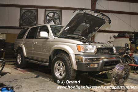 Chris strapped Project SportRunner to the dyno while we discussed how best to perform the runs. The 4Runner has an automatic transmission which makes dynos a little more tricky as you have to find that sweet spot in the speed range to keep the vehicle from downshifting during the run. It's not a huge deal, but having the run in a single gear closest to 1:1 makes for a much cleaner and more accurate dyno graph for viewing. Third gear is closest to 1:1 so we turned OD off, ECT on, and used my custom TRAC Disable switch to defeat vsc/traction control to insure a good clean pass. We found the sweet spot for WOT to be about 67 MPH.