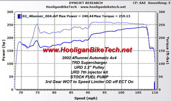 Once the target speed was attained, I would give it WOT and let it run until the speed limiter kicked in at 108 MPH. With the supercharger installed this occurs right at 5100 RPM so I never could take the truck all the way to redline. Underdog Racing makes a speed limiter unlimiter to get rid of this restriction, but 100 MPH in a 4Runner is plenty fast for me, so I'm gonna leave mine alone. I'm left wondering if I might have shown more HP if the full RPM range had been captured on the dyno, but 240 RWHP and 259 RWTQ exceeded my expectations, so needless to say I was thrilled. That's a 100 HP gain over stock!