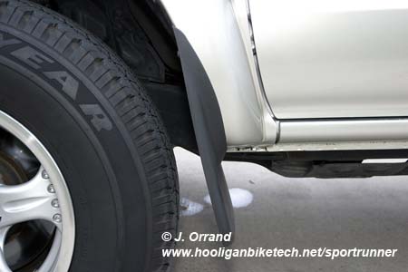 After replacing the factory running boards with a set of tube steps, I needed to install some front splash guards to protect the body panels from debris. Since my 4Runner has the factory extended flares on it designed to work with the running boards, the OEM Toyota front splash guards would not work, and I definitely didn't want to remove the flares. I finally found a set of Highland Contura splash guards (P/N 11051) at Advance Auto.