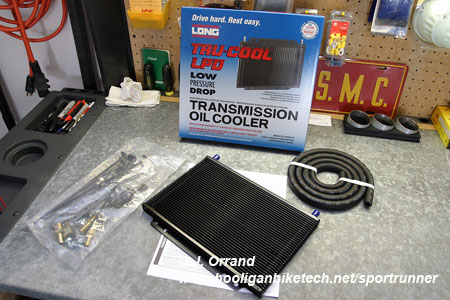 After installing the TRD Supercharger I noticed my transmission temperatures seemed to run about 20 - 40 degrees warmer depending on driving style, ranging from 200* - 220* where as before the supercharger temps would hover around 180* F. I'm not sure if this is a result of the supercharger itself, or a side effect of having more power on tap causing me to give a little more throttle than I did naturally aspirated. In either case, a transmission cooler is a good idea for any automatic transmission and they're cheap to boot. After looking at several offerings, I decided on the Tru Cool 4454 which is good for an 18,000 pound GVWR, is a low pressure drop design, is compact at 7.25" x 11" x .75", and includes hardware for two different mounting options. The low pressure drop design means it allows cold transmission fluid to flow through larger passages allowing the fluid to bypass the cooler to reach operating temperature faster and avoid over cooling in cold weather. As of this writing the price was around $60 US making it a bargain.