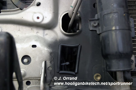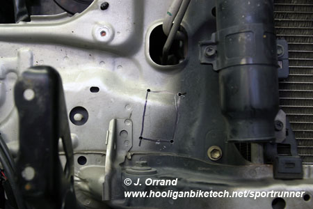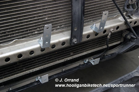 Decide where you want to mount the cooler. I spent about 45 minutes looking it over before deciding to mount it in the center lower area. I found two factory screw holes, one was used by a ground strap wire bolt, and the other wasn't used at all, along the support that the skid plate attaches to. I drilled two 1/4" holes in the front clip cross member for the upper mounting location. I feel this works the best as it gets the cooler down low enough to sit behind the opening in the air dam, it's out of the way of all body mount points, and it keeps the hoses at a large radius where they bend to connect to the cooler's input and output. After several test fits, I had the brackets bent and cut to give a factory installed appearance and a secure mount.