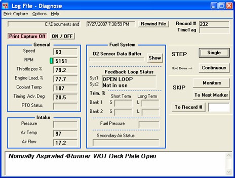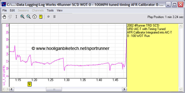I did some more WOT testing, this time in "L" or 1st gear for the auto tranny in Project SportRunner. I did lean out a little close to red line. The vehicle will never get to red line on it's own as it shifts before that point, but if you're a manual tranny, you'll definitely want to address that area.
