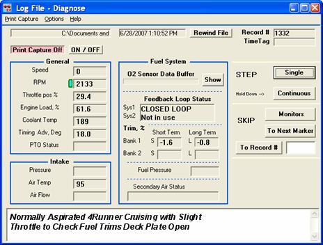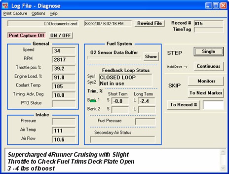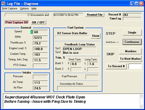 After installing the TRD Supercharger I completed more analysis of the vehicle to see how it reacted to the system before I started tuning. Prior to installation, I did some data logging with the OBD II BR-3 scan tool so that I could go back and compare after the supercharger was installed. There were a few things I was interested in such as fuel trims when cruising around, timing advance at WOT near red line, and intake air temperature. I did the logging on days with similar weather, which has been hot and muggy here in Middle Tennessee, with highs in the 80s F around 6PM with humidity around 40%. The mods to the vehicle were the deck plate being open and the ISR Mod.