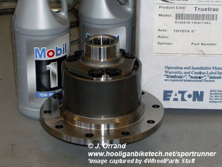 From the factory my rear differential was open, meaning only one wheel got power when throttle was applied. I began looking into traction aid devices to alleviate that issue. I had a Lockrite automatic locker in a 1997 Tacoma 4x4 that I owned and hated it. The Lockrite was noisy, clunky, and often made the rear of the truck feel strange under acceleration. I also had the TRD electric locker in a 1999 TRD Tacoma 4x4 that I owned. I liked this locker much better than the Lockrite, but you couldn't really use it on the road at all, and I had to modify it to work in anything other than 4WD Lo. Electric lockers are also pretty expensive to put in if they didn't come on the vehicle from the factory. After looking at the available options for Project SportRunner, I decided to give the Eaton TrueTrac a try as I had seen very positive reviews.