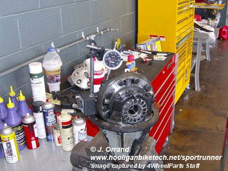 Here's a shot of the stock differential removed from the vehicle as well as one with the TrueTrac installed and getting setup to the proper backlash.