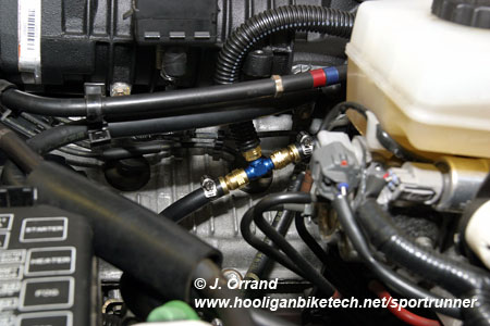 The ECU (called an AIC-T or FTC-T) has an integrated MAP (manifold absolute pressure) sensor to read absolute pressure from the supercharger and is required for the unit to work properly. When tuning the system, the timing and fuel map is like an Excel spread sheet with rows being RPMs and columns being PSI of boost. Simply run the supplied line from the engine bay to the AIC-T. Connect the supplied restrictor T-fitting into the boost line that goes from the supercharger to the stock FMU (fuel management unit). You must use the supplied T-fitting to help cut down on the buzz from the AIC-T's MAP sensor. In the image below you can see how I tied in the AIC-T boost line (top) and boost gauge line (bottom).