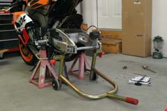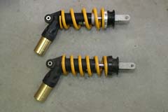 Installation is a breeze if you have aftermarket fixed rear sets. Just prop the bike up on jack stands using a rear stand, then using pages 15-2 and 15-14 through 15-17 of the repair manual, remove the rear shock assembly through the bottom of the swing arm. Begin by removing the 17mm nut and 14mm bolt on the rear of the link as well as the 8mm hex bolt on the front. Next remove the 14mm upper and lower shock mounting bolts. The shock will come out the bottom of the swing arm. I did the work when having the rear tire changed out on my bike to make the job easier, but it's not necessary to remove the rear tire. Modulating the swing arm up or down a 1/2" or so will help in removing the bolts.