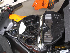 If you're racing and want to completely remove the system for the 8 ounces in weight it may save you, you'll have to do a little more work. Open the air box by removing the 6 phillips head screws and unplug the IAT sensor. Remove the air filters. BE CAREFUL that no debris falls out of the air filters and into the intake ports. I'd recommend laying a lint free towel over the intake ports just to be sure nothing gets in there. The air filters filter air from the inside out and mine were full of bugs and other debris. Loosen the upper fuel injector harness mounting tab to give some slack. Remove the upper air box housing by removing the 8 phillips head screws around its perimeter.