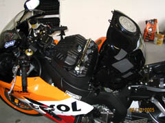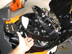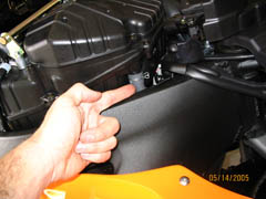 There is a rubber skirt around the air box. If you unhook a couple of the tabs on the right hand side you'll be able to see the PAIR tube that goes to the air box. For the purposes of dyno runs, you can pinch this hose off with a pair of locking vice grips and this will disable the system as no air can be pulled from the air box to be injected into the exhaust ports. Once the dyno runs are complete, simply unclamp the vice grips and button her up and you're done. It takes about 15 or 20 minutes to get to the hose if you take your time, and a little more than that to put things back together. When putting the tank cover back on the bike you may have a little difficulty with the rubber gasket that's around the fuel cap. It has a tendency to hang on the plastic tabs on the tank cover around the hole for the fuel cap. Applying some water to the rubber gasket will help the tank cover slide on easier.