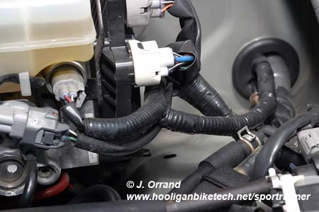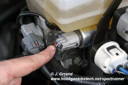 The connector that needs to be modified at the master cylinder is pointed out in the picture below. This is the master cylinder pressure sensor. This mod basically makes the ABS system think there's a malfunction, and the system is disabled. Simply remove some of the wire loom to expose the RED wire. There is a gray hard plastic cover over these wires that will also need to be trimmed back to expose this red wire. Be careful not to cut any wires when exposing them. Once you've got 6" or so of the red wire exposed, cut it and wire your switch in using the water proof butt connectors. Don't forget to put the heat shrink on before connecting the wires. Once they're all connected up, melt the heat shrink over the connections. It's important that this connection is secure and protected. Once your finished with the connections, run the switch wires through the large rubber grommet on the firewall into the cab. Cover your switch wires with the corrugated wire loom and tape it up with electrical tape for a factory installed appearance. Mount the switch in a blank dash port and you're done. Since this is an on/off switch it doesn't matter which pin you connect each wire to on the switch.