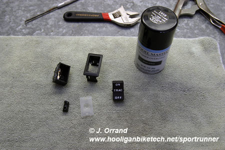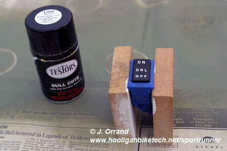 If you want to go an extra step and label the switch for a factory appearance, tape up the outer trim with some painter's tape and lightly sand the switch with some 220 grit sand paper to knock the sheen off. Once sanded, wipe the switch down with some paint prep. Next use a tooth pick and apply the appropriate dry transfer letters. These letters aren't the easiest things to apply to the switch as getting them even is quite a challenge so you may want to buy two packs of letters for some insurance. Once the letters are applied, spray 2-3 light coats of the clear lacquer on the switch. This will seal the letters and keep them from getting rubbed off with use. Be sure to use clear coat designed for plastic or it'll turn cloudy and peel. I learned that the hard way